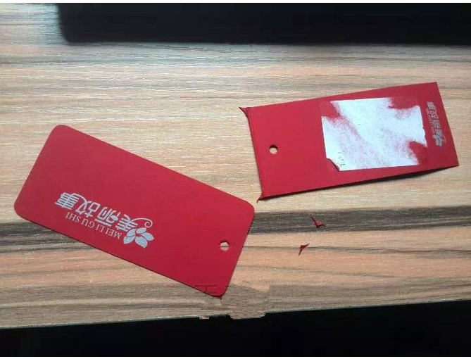 將吊牌上的繩子割開然后攤開吊牌,有些吊牌上面會(huì)貼有價(jià)格或其他的帖紙,即使將貼紙撕下來(lái)了也會(huì)留有一個(gè)印,那這邊的吊牌就不好利用了,果斷放棄,咱留一半就好。