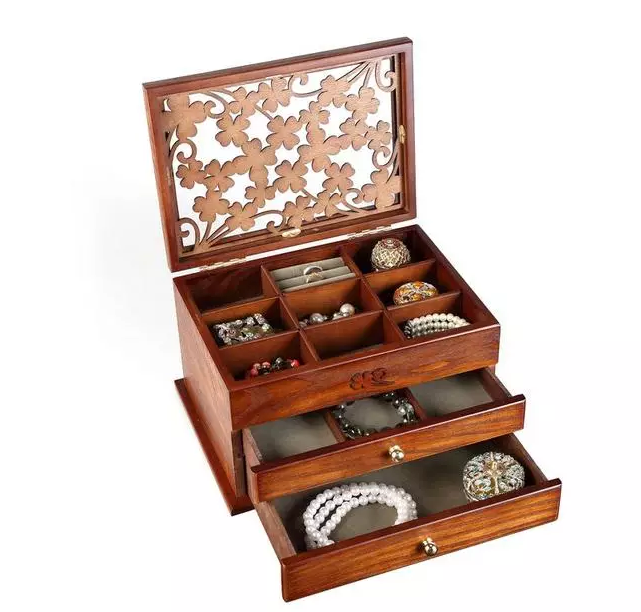 而作為一個首飾盒廠家的小編,在見過各式各樣的首飾盒之后還是覺得木質(zhì)首飾盒最讓我心動。在大多數(shù)人眼中,木質(zhì)首飾盒更適合南方婉約女子專用,這種首飾盒造型優(yōu)雅別致,中國風(fēng)味十足,透出一股別樣風(fēng)情。木質(zhì)首飾盒一般取材于松木、紅木、柞木、黑檀木、楸木?,F(xiàn)在的珠寶首飾盒是這樣分布,戒指墊條、耳釘固定洞、耳釘固定墊、蝴蝶卡遮蓋墊、手表包墊、手鐲包墊、項鏈鉤、小格間、首飾袋、拎手、鏡子。你的所有珠寶首飾都有放置的地方,真是個百寶箱呢。