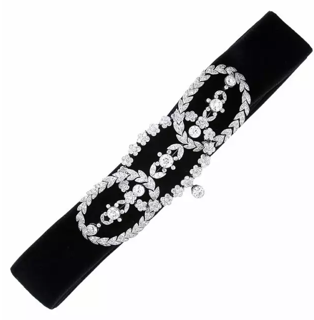 典型的代表是寬領(lǐng)式項(xiàng)鏈,這種圍頸式項(xiàng)鏈由維多利亞時(shí)期的薄紗變成了黑天鵝絨底襯或者有別扣的絲帶,中間裝飾著花朵或者帶扣,有時(shí)候也是單純鉑金鑲嵌,上面加上珍珠以及鉆石點(diǎn)綴,這不是現(xiàn)在流行趨勢(shì)正猛的“狗帶”嗎?