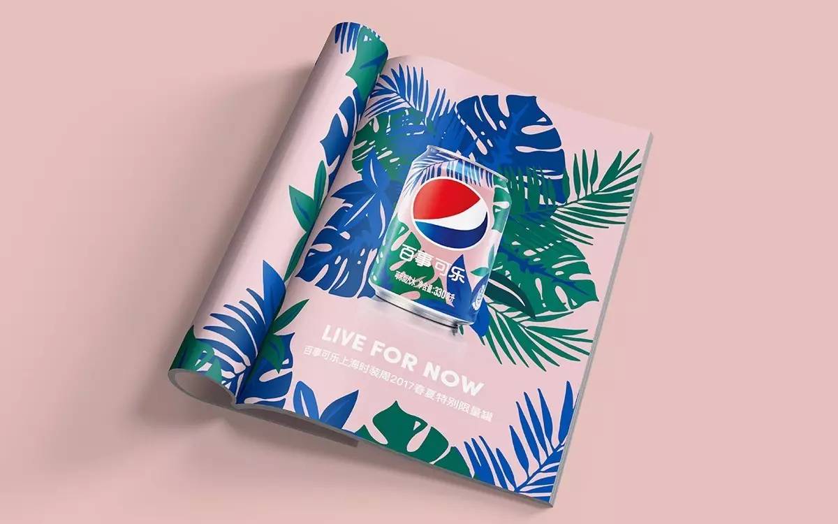 這款限量版包裝是百事可樂為“LIve for Now”精神與上海時裝周特別設(shè)計的,在以往的海洋藍(lán)中大量加入粉色,加上大面積熱帶的棕櫚葉,喚起了春夏的氛圍,輕松又活潑。