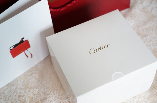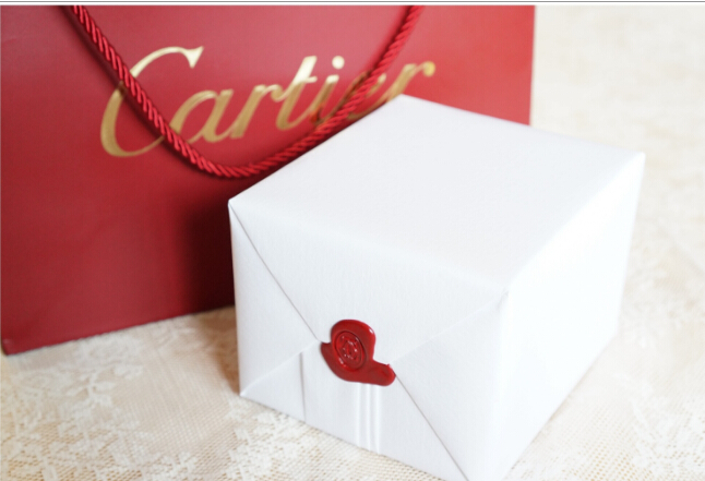 首先,包裝紙上的這個印著Cartier家logo的蠟印,打開包裝紙后,盒子外面還有一個白色的紙盒,紙盒上面簡潔大方地印著"Cartier"的字樣。