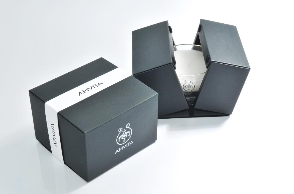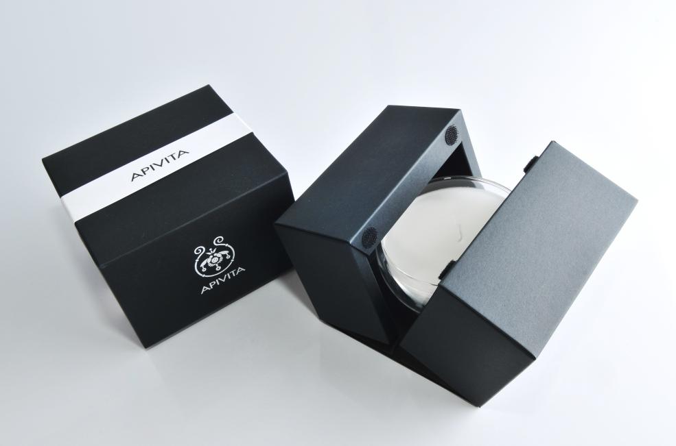 APIVITA香薰蠟燭包裝,黑色卡紙的盒型結構比例合理、結構嚴謹、造型簡單精美,突顯出盒型的形態(tài)與材質美,力求達商品保護并襯托出透明蠋臺的層次感,左右開盒的禮盒效果展現(xiàn)商品驚喜的價值感。