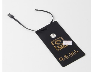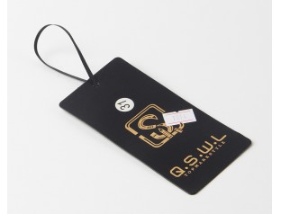 此款商標吊牌廠家選用黑卡紙,商標燙金,黑卡紙是特種紙的一種,其表面平整光滑,挺度好,拉力好,耐破度高此款吊牌設計選用了黑色作為主體色,搭配醒目燙金的LOGO,更彰顯其品牌價值吊牌設計采用了經(jīng)典的黑色和金色配合,沉靜的黑色能隱去燥熱,璀璨的金色能喚起您喜悅的心情