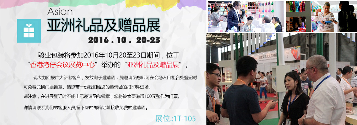 亞太區(qū)內(nèi)其中一項(xiàng)舉足輕重的超大型貿(mào)易展會(huì)-亞洲禮品及贈(zèng)品展將于2016年10月20至23日香港灣仔國際會(huì)議展覽中心隆重舉行,屆時(shí)廣州駿業(yè)包裝盒制作廠家將盛裝亮相。