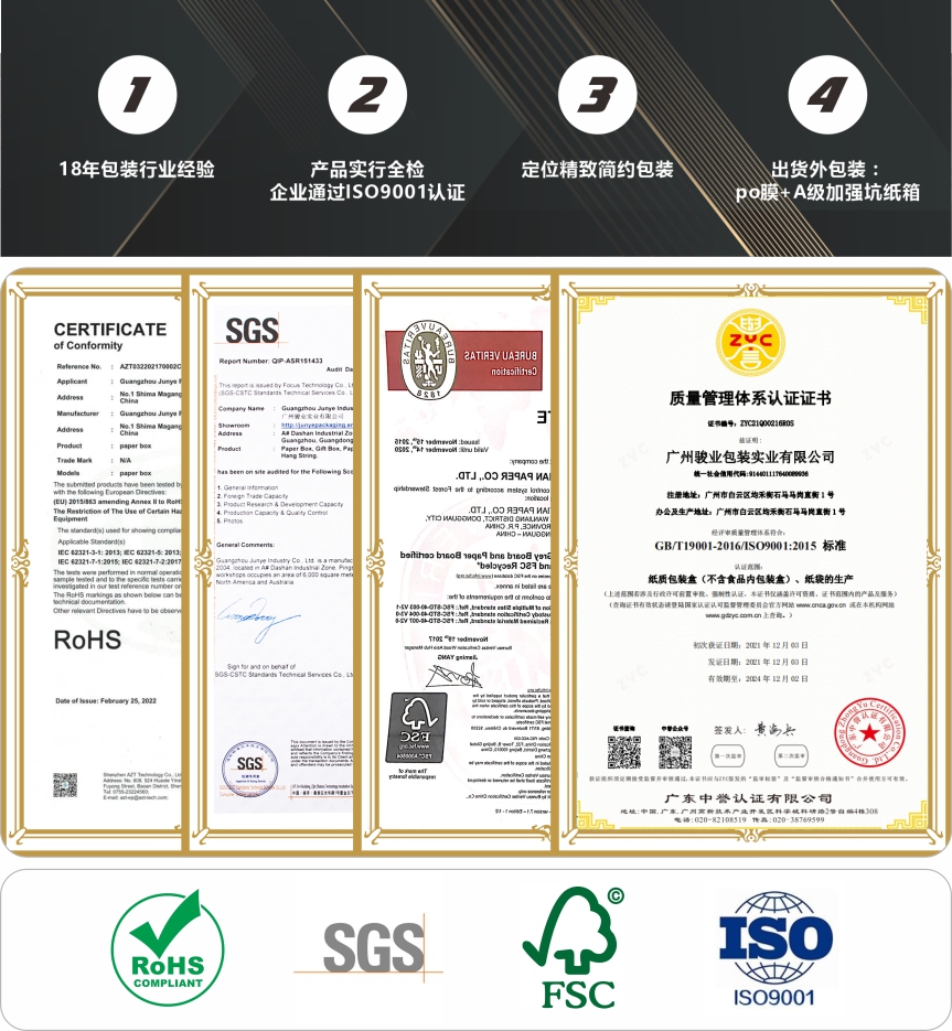 駿業(yè)包裝提供OEM專業(yè)服務,原材料進廠時檢驗,產前首件檢驗確認,生產中不間斷巡檢,全檢,A級加強型坑紙箱打包,嚴格按照ISO:9001質量管理體系控制生產流程出貨。另外我們有經驗豐富的服務團隊可以根據(jù)您的需求,為您量身制定產品包裝方案。